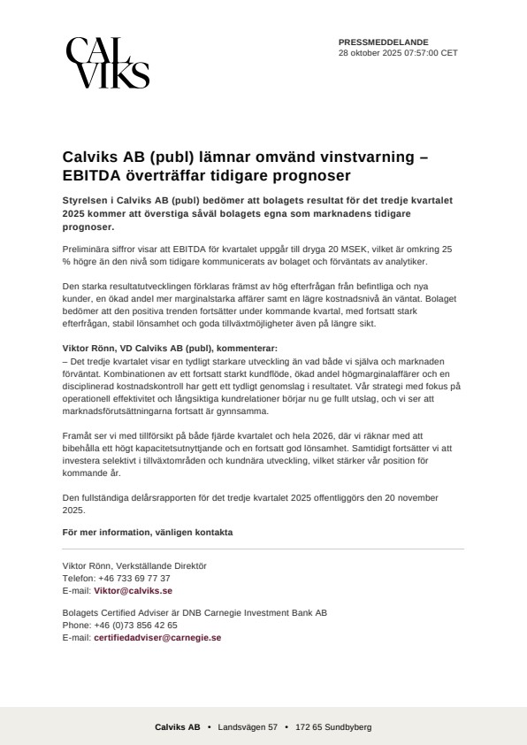 Styrelsen i Calviks AB (publ) bedömer att bolagets resultat för det tredje kvartalet 2025 kommer att överstiga såväl bolagets egna som marknadens tidigare prognoser.