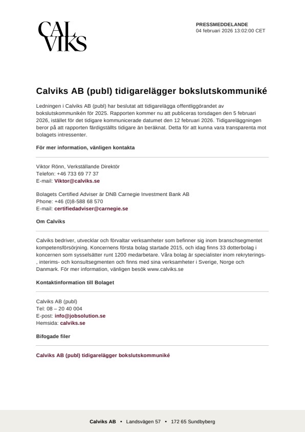 Ledningen i Calviks AB (publ) har beslutat att tidigarelägga offentliggörandet av bokslutskommunikén för 2025. Rapporten kommer nu att publiceras torsdagen den 5 februari 2026, istället för det tidigare kommunicerade datumet den 12 februari 2026. Tidigareläggningen beror på att rapporten färdigställts tidigare än beräknat. Detta för att kunna vara transparenta mot bolagets intressenter.