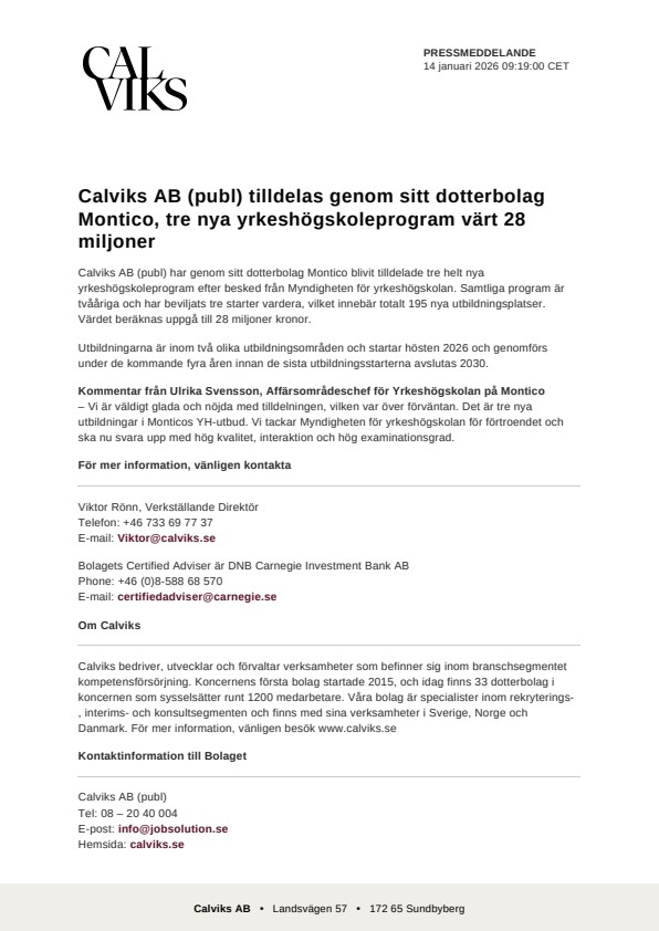 Calviks AB (publ) har genom sitt dotterbolag Montico blivit tilldelade tre helt nya yrkeshögskoleprogram efter besked från Myndigheten för yrkeshögskolan. Samtliga program är tvååriga och har beviljats tre starter vardera, vilket innebär totalt 195 nya utbildningsplatser. Värdet beräknas uppgå till 28 miljoner kronor.