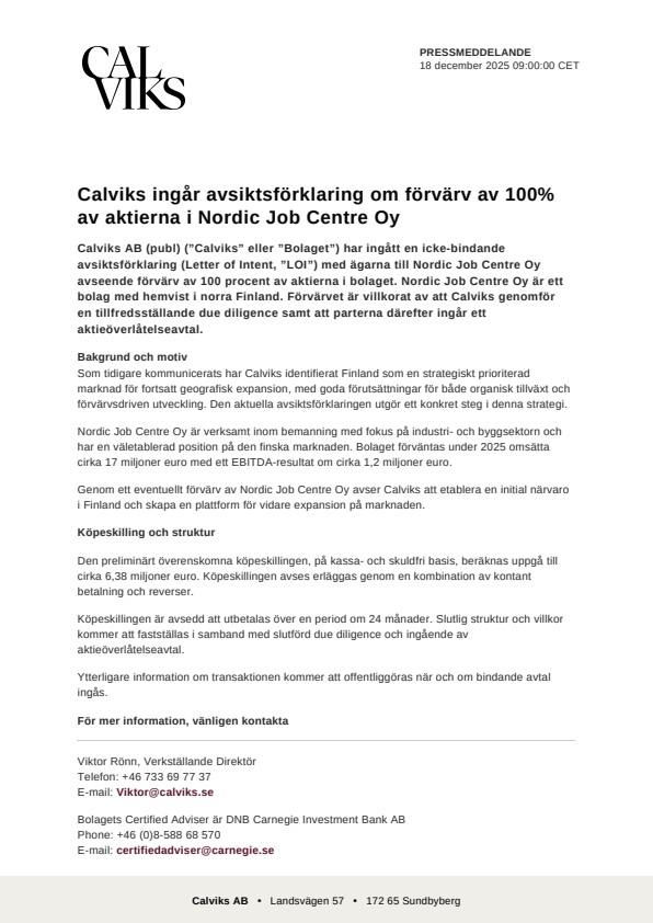 Calviks AB (publ) (”Calviks” eller ”Bolaget”) har ingått en icke-bindande avsiktsförklaring (Letter of Intent, ”LOI”) med ägarna till Nordic Job Centre Oy avseende förvärv av 100 procent av aktierna i bolaget. Nordic Job Centre Oy är ett bolag med hemvist i norra Finland. Förvärvet är villkorat av att Calviks genomför en tillfredsställande due diligence samt att parterna därefter ingår ett aktieöverlåtelseavtal.