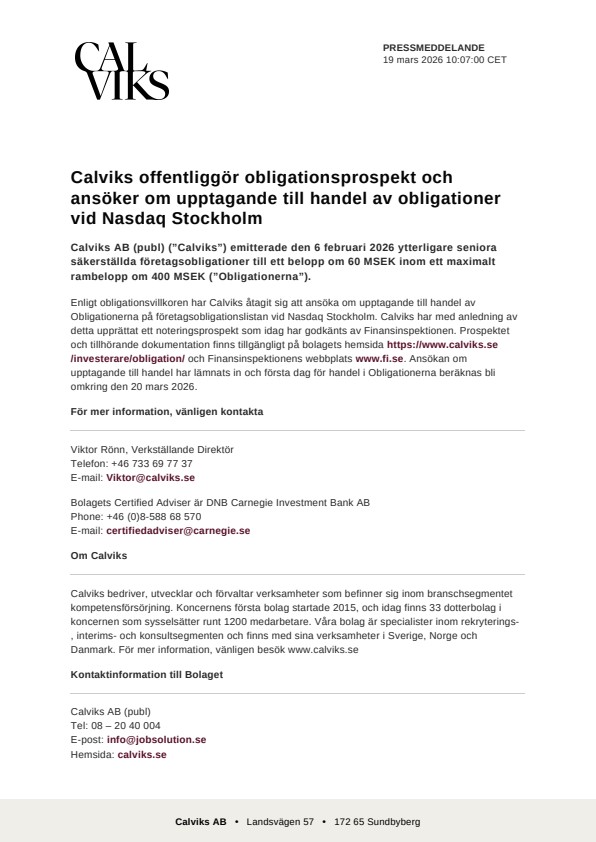 Enligt obligationsvillkoren har Calviks åtagit sig att ansöka om upptagande till handel av Obligationerna på företagsobligationslistan vid Nasdaq Stockholm. Calviks har med anledning av detta upprättat ett noteringsprospekt som idag har godkänts av Finansinspektionen. Prospektet och tillhörande dokumentation finns tillgängligt på bolagets hemsida https://www.calviks.se/investerare/obligation/ och Finansinspektionens webbplats www.fi.se. Ansökan om upptagande till handel har lämnats in och första dag för handel i Obligationerna beräknas bli omkring den 20 mars 2026.