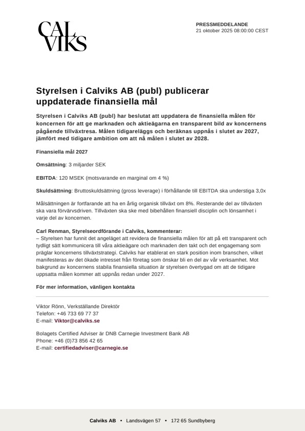– Styrelsen har funnit det angeläget att revidera de finansiella målen för att på ett transparent och tydligt sätt kommunicera till våra aktieägare och marknaden den takt och det engagemang som präglar koncernens tillväxtstrategi. Calviks har etablerat en stark position inom branschen, vilket manifesteras av det ökade intresset från företag som önskar bli en del av vår verksamhet. Mot bakgrund av koncernens stabila finansiella situation är styrelsen övertygad om att de tidigare uppsatta målen kommer att uppnås redan under 2027.
